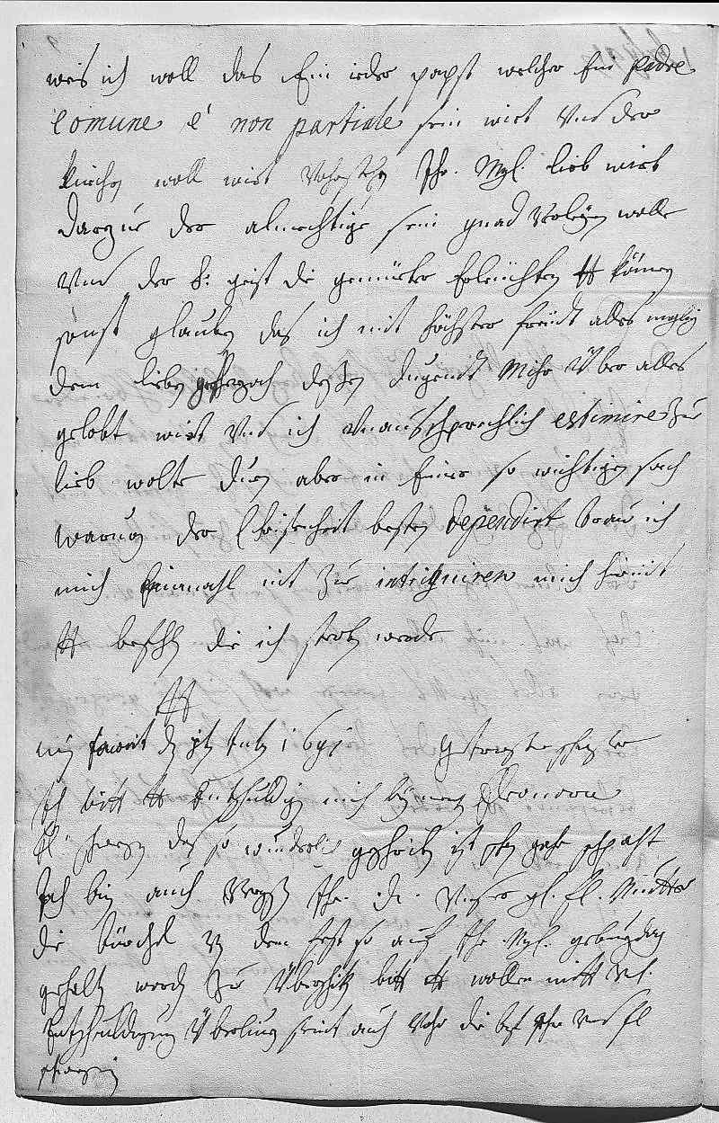 0015weis ich woll, das ein ieder Papst, welcher ein padre 0016comune è non partiale sein wirt vnd der 0017kirchen woll wirt vohrstehn, ihr Mayestät lieb wirt sein, 0018darzue der almechtige sein gnad verleyen wolle 0019vnd der heilige geist die gemüeter erleüchten. Dero Liebden können 0020sonst glauben, das ich mit höchster freüdt alles moglig 0021dem lieben Grosherzoch, deßen dugendt mihr über alles 0022gelobt wirt vnd ich vnausschprechlich estimire, zue 0023lieb wolte duen, aber in einer so wichtigen sach, 0024waruon der cristenheit besten dependirt, traw ich 0025mich einmahl nit zue intriguiren. Tue mich hirmit 0026dero Liebden befehlen, die ich sterben werde 0027dero Liebden 0028getrewste schwester 0029Eleonora 0030Wien Fauorit den 1ten julij 16910031Ich bitt, dero Liebden entschuldigen mich bey meiner 0032fraw schwegerin, das so wunderlich geschriben, ist schon gahr schpaht. 0033Ich bin auch vergeßen, ihr Durchlaucht, vnser geliebsten fraw mutter, 0034die büechel von dem fest, so auf ihr Mayestät geburzdag 0035gehalten worden, zu überschiken, bitt, dero Liebden wollen sie mitt vnterdehnigster 0036entschuldigung überliuern, seint auch vohr die brif ihr vnd fraw 0037schwegrin.