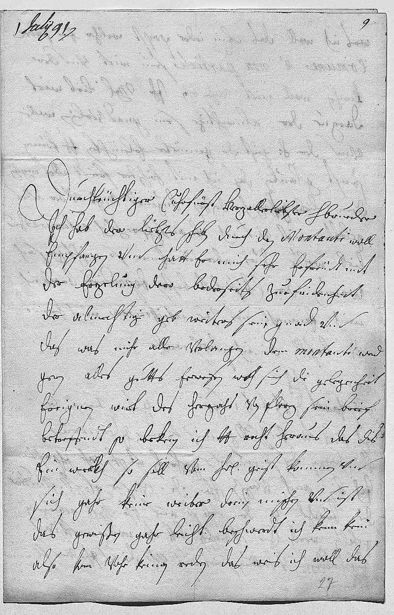 00011 julij 910002Durchleüchtiger Cuhrfürst, herzallerliebster herr brueder 0003Ich hab dero liebsts schreiben durch den Montauti woll 0004empfangen, vnd hatt er mich sehr erfreüdt mit 0005der erzelung dero bederseits zuefridenheit, 0006der almechtige geb weiters sein gnad vnd 0007das, was mihr alle verlangen. Dem Montanti werd 0008gern alles gutts erweisen, woh sich die gelegenheit 0009ereignen wirt. Des Herzochs von Florenz sein brief 0010betreffendt, so bekenn ich dero Liebden recht heraus, das dis 0011ein werkh, so soll vom heiligen geist kommen vnd 0012sich gahr keine weiber drein mischen, vnd ist 0013das gewißen gahr leicht beschwerdt. Ich kenn kein, 0014also kan vohr keinen reden. Das weis ich woll, das
