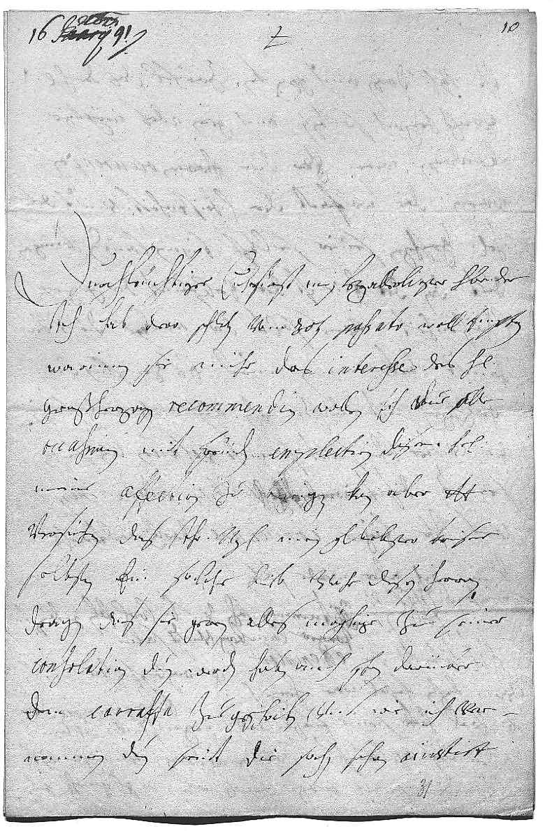 0014Ihr Mayestät dragen auch ganz kein zweifel, das der herr 0015Großherzoch selbsten auch gern alles möglige 0016beidragen weren zue disen schwerern occurenzen, 0017waran die wolfart der christenheit vndt des 0018herrn Grosherzogen seiner selbst eignen landen henngen 0019duet, dan der eine ist der erbfeindt der ganzen 0020christenheit, vnd solte der andre die über- 0021handt bekommen, wurd es gewislich dem 0022Großherzoch nit beßer gehn als andren andren fürsten, 0023die vnter ihm seint, so mehr sclauen als fürsten 0024seindt. Dises wurden d Großherzog selbsten consideriren 0025vnd ihr eigne conueniens darbey bedtrachten 0026können. Ich aber werde sterben 0027dero Liebden 0028getrewste schwester 0029Eleonora 0030Wien den 16ten jener 16910031Schik hibey dero Liebden die exemplar 0032vom lezten festel, war herzich. 0033Bruder Carl hatt seine fueß woll gezeicht vnd von 0034allen das aplausum daruon gedragen, vnmüglich ist 0035izt die music abzueschreiben, dero Liebden wolen dero fraw gemahl geben. 00361Mit meinem sohn vnd bruder Carl haben gedanst 0037Iörger, Lamberg vndt Salm .