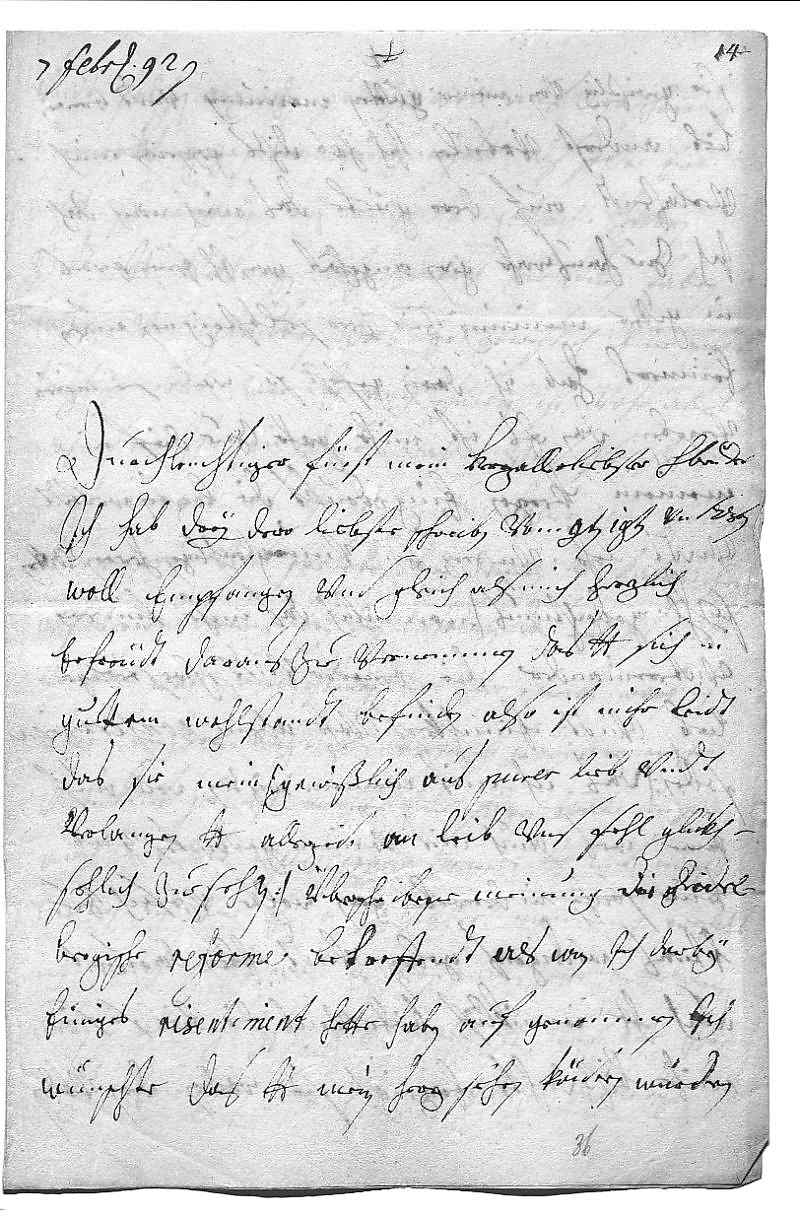 00012 februarij 920002Durchleüchtiger Fürst, mein herzallerliebster herr bruder 0003Ich hab drey dero liebste schreiben vom 9ten, 19ten vnd 23ten0004woll empfangen. Vnd gleich als mich herzlich 0005erfreüdt daraus zue vernemmen, das dero Liebden sich in 0006guettem wohlstandt befinden, also ist mihr leidt, 0007das sie mein (gewißlich aus purer lieb vndt 0008verlangen, dero Liebden allezeit an leib vnd sehl glükh- 0009sehlich zue sehn) überschribene meinung, die heidel- 0010bergische reforme betreffendt, als wan ich darbey 0011einiges risentiment hette haben, auf genommen. Ich 0012wünschte, das dero Liebden mein herz sehen könten, würden