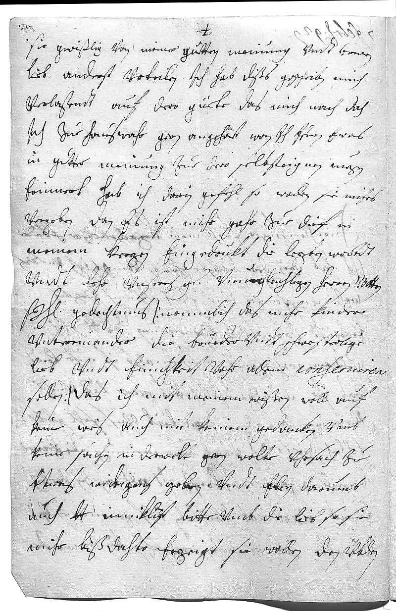 0013sie gewißlig von meiner guetten meinung vndt trewen 0014lieb anderst vrteilen. Ich hab dißes geschriben, mich 0015verlaßendt auf dero güete, das mich nach, dah 0016ich zue haus wahr, gern angehört, wan ich ihnen etwas 0017in gutter meinung zue dero selbsteignen nuzen 0018erinnert. Hab ich darin gefehl, so wollen sie mihrs 0019vergeben, dan es ist mihr gahr zue dief in 0020meinem herzen eingedrukt die lezten wortdt 0021vndt lehr vnseres gnädigen vnuergleichligen herren vatter 0022sehligen gedechtnus (nemmlich das mihr kinder 0023vntereinander die brüeder vndt schwesterlige 0024lieb vndt einichkeit vohr allem conseruiren 0025sollen), das ich mit meinem wißen woll auf 0026keine weis, auch mit keinem gedanken vmb 0027keine sachen in derwelt gern wolte vhrsach zue 0028etwas widrigens geben, vndt eben darumb 0029auch dero Liebden inniklist bitte vmb die lieb, so sie 0030mihr biß dahto erzeigt, sie wollen den üblen