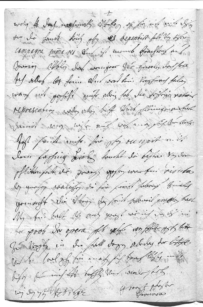 0086wolen dero Liebden doch nochmahlen überlegen, ob sie nit mit disen 0087an die handt könten gehn, es dependirt halt von diser 0088campagne summa rei, vnd ist meines erachtens aus 0089zweien üblen das wenigere zue erwelen. Doch stell 0090ich alles dero Liebden heim vnd werd kein verschmach haben, 0091wans nit geschiht, nuhr allein hab die hiesige rations 0092representiren wollen. Allein bitt vmb schleünige antwort, 0093damit man wiße, auf was man sich zue verlaßen. 0094Jezt seint mihr hier schon occupirt mit 0095dem fasching. Hierbey kombt die lista von der 0096schlittenfart, die gewesen. Gestern war ein rionta0097von gewisen wälischen, die hier seint, habens zimlich 0098gemacht. Die übrigen dag seint alleweil proben, balt 0099von ein, balt von andern gewest, wie ich dan dis in 0100der prob der opera schreib, also wan fehler geschen, bitt 0101zue vergeben. In der statt dagen alledag der Cuhrfürst 0102vnd bruder Carl, gehn hin, machen sich braf lustig. Mit 0103disen due mich dero Liebden befehlen vnd werde sterben 0104dero Liebden 0105getrewste schwester 0106Eleonora 0107Wien den 7ten februarij 1692