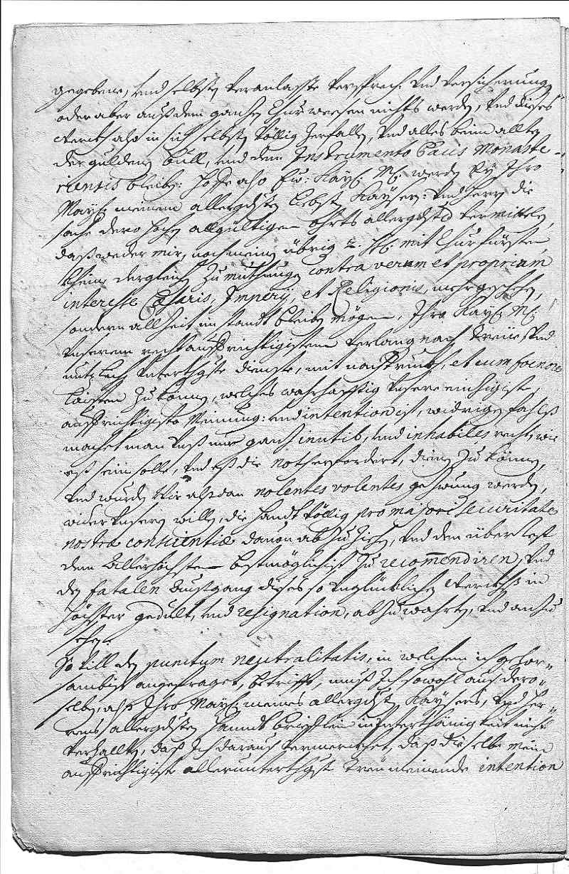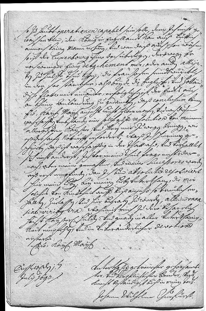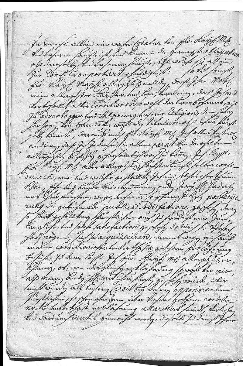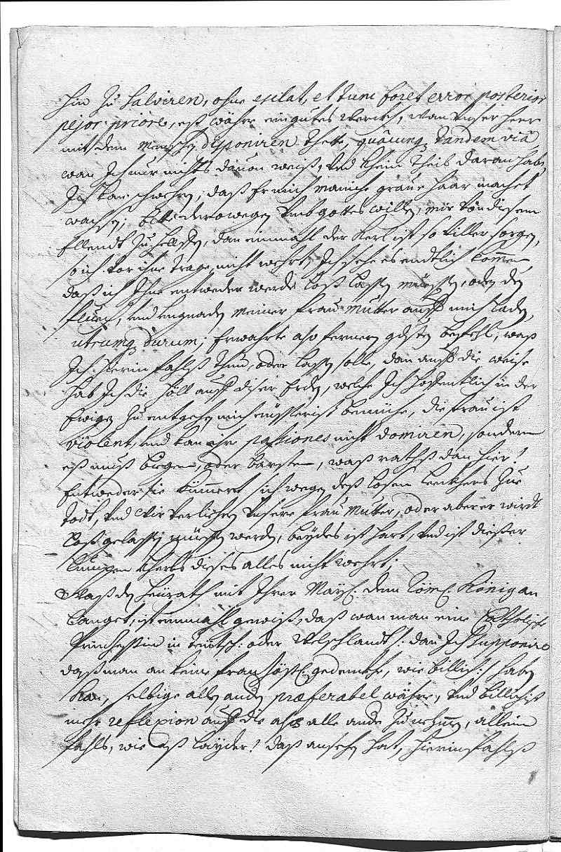 Freut sich, dass EMT wieder wohlauf ist und dankt für die Nachfrage nach seiner eigenen Gesundheit. – Bedauert, dass die Mutter nicht länger in Wien bleiben möchte; sobald es in Düsseldorf wieder sicherer ist, wird JW versuchen, sie zu überreden, dauerhaft bei ihm zu bleiben. – EMT kann aus den Beilagen ersehen, was die Mutter JW mit gestrigem Kurier in der „bewussten Materie“ geschrieben hat, und auch, was er ihr antwortet und was für prophetisches ungereimtes Zeug sein Bruder, der Bischof von Augsburg, JW in dieser Angelegenheit geschrieben hat; bittet EMT, ihm einen Ausweg aus seinem Dilemma zu eröffnen, denn er will weder den Dr. (Doktor Schweizer) freilassen noch den Fluch und die Ungnade der Mutter auf sich ziehen. – Falls als Braut für den römisch-deutschen König Joseph I. keine deutsche oder italienische katholische Prinzessin zu finden sein sollte, wäre die Verbindung mit Schweden am vorteilhaftesten, da dabei eine Stärkung der (Augsburger) Allianz , mehr militärische Unterstützung gegen Frankreich und vielleicht auch ein örtlich begrenztes katholisches exercitium publicum in Schweden zu hoffen sei. EMTs Bedenken über eine möglicherweise unechte Konversion der Prinzessin teilt JW nicht, da sie bereits in jungen Jahren bekehrt würde. – Wenn JW die Kurwürde Hannovers anerkennen würde, ohne dass er und die beiden anderen zurückgesetzten Kurfürsten vorher einen Ausgleich erhalten, würde er alle Glaubwürdigkeit bei den opponierenden Kurfürsten und Fürsten verlieren. Hannover müsste dann etwa bezüglich der böhmischen Kurstimme keine Rücksicht mehr auf den Kaiser nehmen; überhaupt wären große Nachteile für die katholische Sache zu befürchten. – JWs Frage bezüglich einer möglichen Neutralität seiner verbleibenden Lande bezog sich nur auf den Fall, dass Bonn, Köln, Jülich und Düsseldorf von den Truppen des Dauphin überrannt würden, was angesichts der fehlenden militärischen Unterstützung leicht passieren könnte. Nachdem die Kurpfalz schon für Kaiser und Reich geopfert wurde, würde ihn dann nur noch die Neutralität davor bewahren, alles zu verlieren und als Bettler zu enden. Auch im Sinne seiner Frau und seiner Nachfolger ist JW entschlossen, in Pfalz-Neuburg zu bleiben, dessen Untertanen ihm seit seiner Kindheit so treu den Lebensunterhalt gestellt haben.