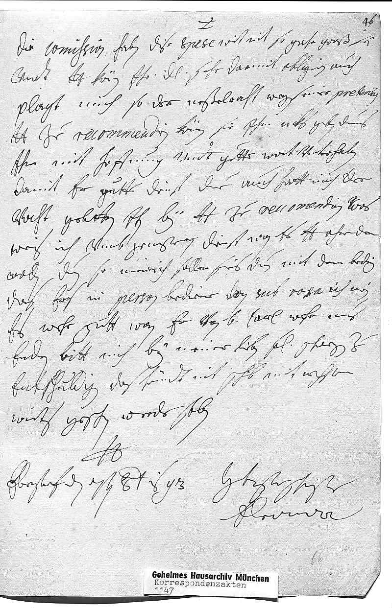 0016werden zue ihr Durchlaucht reputation, vnd darnach wolt ich 0017dero Liebden schreiben. Weil er aber izt nit kombt, so bleibt die 0018sach wie sie ist, vnd dero Liebden antworten nuhr ohn mas- 0019gebung ihr Durchlaucht, vnser geliebsten fraw mutter. Ich hett ihnen 0020geschriben, ich wurd mit dem Bischoff reden vnd dornach 0021ihnen meine meinung schreiben, vnterdeßen sollen die sachen 0022im alten standt bleiben, der Doktor werde schon woll tractirt, 0023welches ich auch dero Liebden reccomendire, mihr müeßen nuhr 0024sehen zeit zue gewinnen. Der Deütschmeister ist in 0025der sachen niks informirt, ich hab ihm aber izt auch 0026geschriben, aber noch kein antwort. Ihr Durchlaucht fraw mutter haben mihr 0027auch gnädig befohlen, dero Liebden zue schreiben, sie möchten dem Irsch 0028befehlen, das er ihr etlige sachen, welchen bey des Doktor 0029sachen, die im gewölb seindt, hatt solle volgen laßen vndt 0030auch in specie ein conterfet kastel, das sie einer von 0031ihren freilen hatt geschenkt, die verheirat ist. Dises, meine 0032ich, wehr kein bedenken, vnd dero Liebden bey ihr Durchlaucht dardurg 0033dero deuotion erzeigen können. Auch hab ich vernommen, 0034als verlangeten ihr Durchlaucht, das dero Liebden die iägerei zum 0035iagen möchten spesiren, vnd solle der Hamilton von ihr Durchlaucht