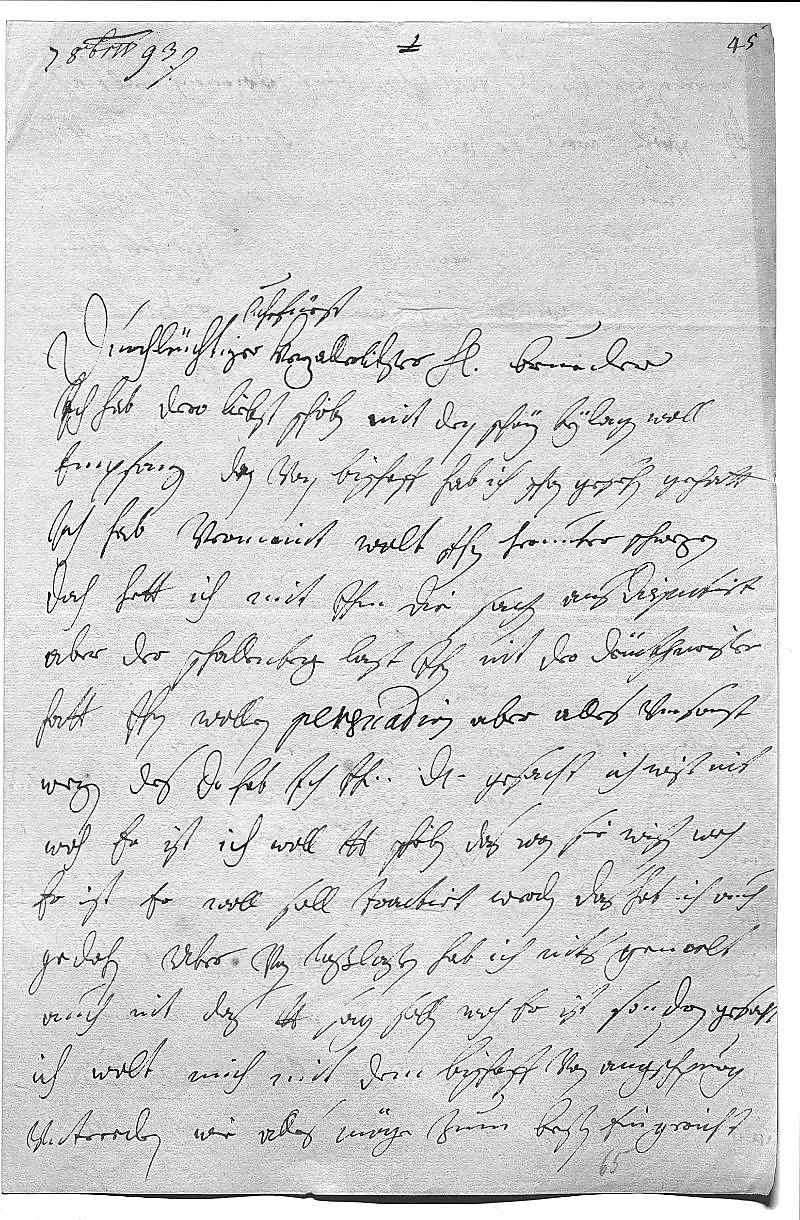 0036die comission haben, dise spese wirt nit so gahr groß sein, 0037vndt dero Liebden könen ihr Durchlaucht sehr darmit obligirn. Auch 0038plagt mich so der Neßelraht wegen seiner pretension 0039dero Liebden zue recommendiren, können sie ihm niks geben, duns 0040ihm mit hoffnung vndt gutte wort vnterhalten, 0041damit er gutte dienst due. Auch hatt mich der 0042Vocht gebetten, ihn bey dero Liebden zue reccomendiren, was 0043weis ich vmb geweßen dienst. Wan es dero Liebden ohne dem 0044wollen dun, so meinich sollen sies duen mit dem beding, 0045das ers in person bediene, dan, sub rosa, ich mein, 0046es wehr gutt, wan er von bruder Carl weg wehr. Mus 0047enden, bitt mich bey meiner lieben fraw schwegerin zu 0048entschuldigen, das heündt nit schreib, mit nechstem 0049wirts geschen. Werde sterben 0050dero Liebden 0051getrewste schwester 0052Eleonora 0053Eberstorf den 7ten octobris 1693