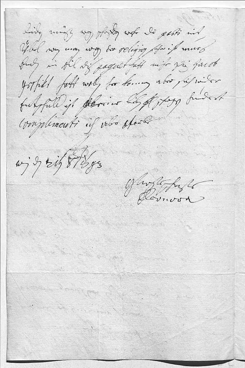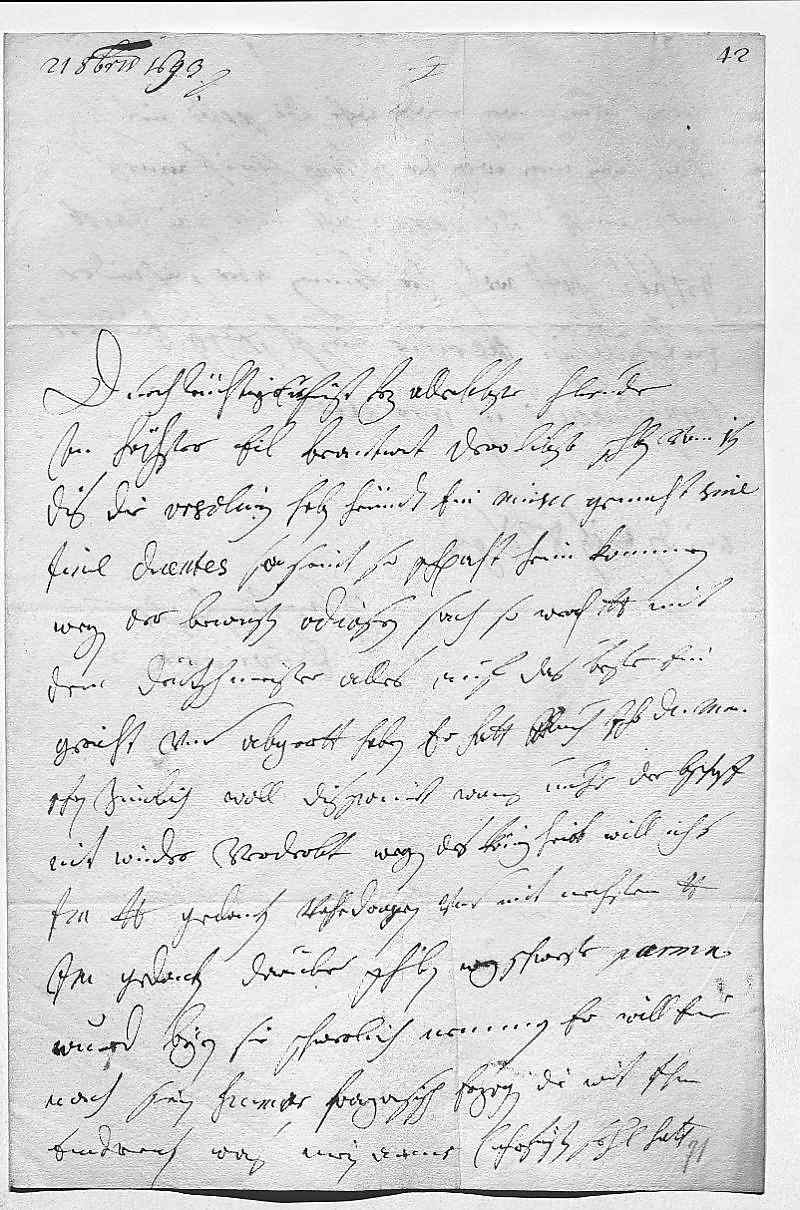 000121 octobris 16930002Durchleüchtiger Curfürst, herz allerlibster herr bruder 0003In höchster eil beantwort dero libste schreiben vom 1ten 0004dis, die orsolinen haben heündt ein music gemacht sine 0005fine dicentes, so seint so schpaht heim kommen. 0006Wegen der bewusten odiosen sach, so werden dero Liebden mit 0007dem Deütschmeister alles auf das beste ein- 0008gericht vnd abgerett haben. Er hatt auch ihr Durchlaucht mama 0009schon zimlich woll disponirt, wans nuhr der Bischoff 0010nit wider verderbt. Wegen des König heirat will ichs 0011ihr Mayestät dero Liebden gedanken vohrdragen vnd mit nechstem dero Liebden 0012ihr Mayestät gedanken darüber schreiben. Wegen schwester Parma, 0013wurd Beyrn sie schwerlich nemmen, er will eine 0014nach sein humor, franzosisch erzogen, die wirt ihm 0015erdragen, was mein arme Cuhrfürstin sehlige hatt