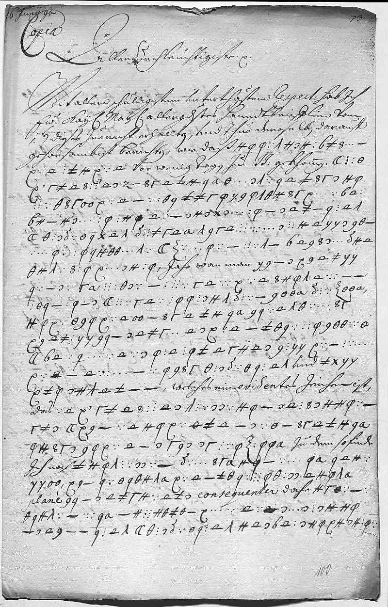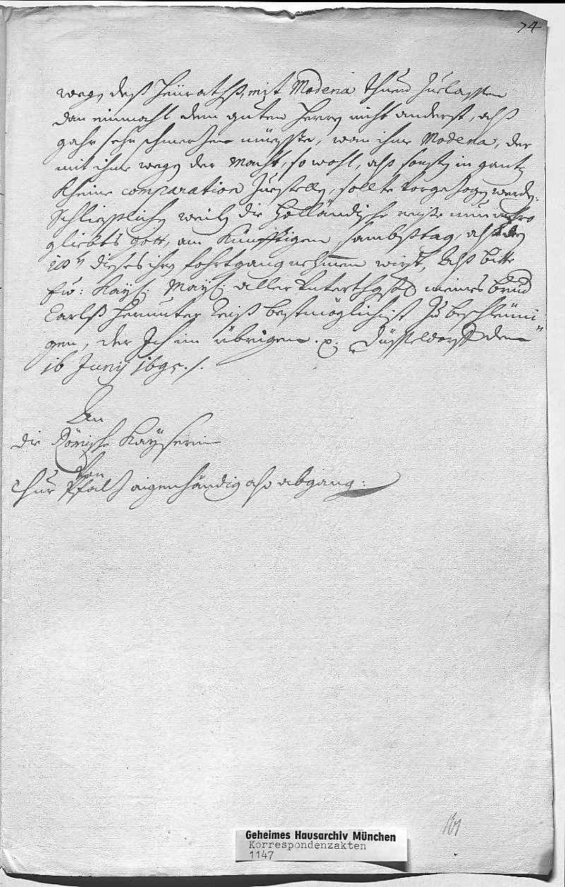 0056wegen deß heürathß mit Modena thuen zuelassen, 0057dan einmahl dem guten herren nicht anderst, alß 0058gahr sehr schmerzen müesste, wan ihme Modena, der 0059mit ihme wegen der macht, so wohl, alß sonsten in gantzen 0060kheine comparation zuestellen, sollte vorgezogen werden. 0061Schliesslichen weilen die holländische reiße nunmehro 0062gliebts gott, am künfftigen sambstag, alß den 006318ten dieses ihren fohrtgang nehmmen wirdt, alß bitte 0064ewer kayserliche Mayestät allervnterthänigst meines bruder 0065Carlß herunter reiß bestmöglichist zu beschleüni- 0066gen, der ich im übrigen etc. Düsseldorff den 006716 junij 1695 0068An 0069die römische Kayserin 0070von Chur Pfalz aigenhändig also abgangen.