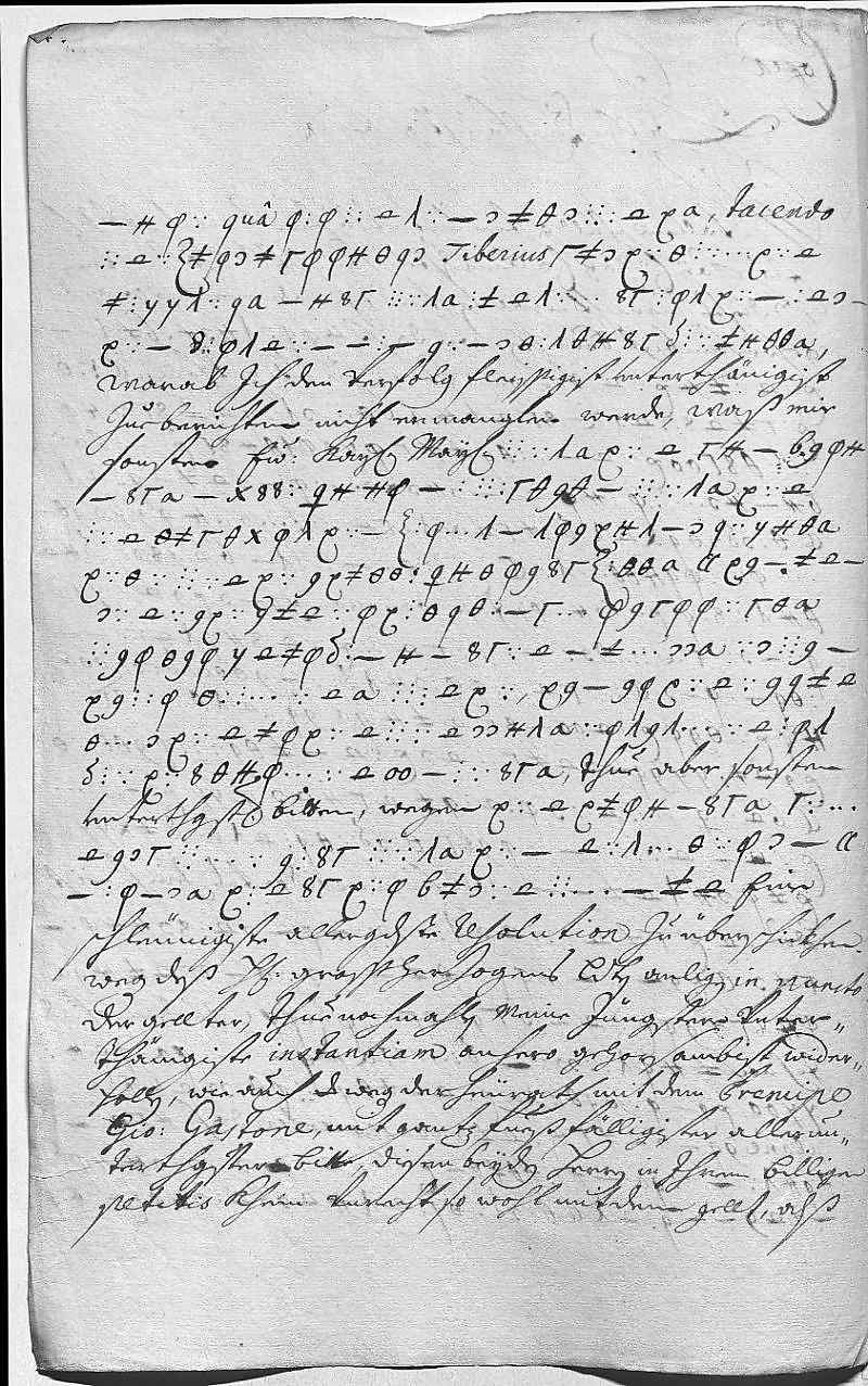 0030sine qua non vorgestelt worden, tacendo 0031vor bekant ahnnimbt.Tiberiushat dem Veider0032auffgeben, sich wegen vergleichung des orts0033des congresses bestmoglich zue eillen,0034warab ich den verfolg fleissigist vnterthänigist 0035zue berichten nicht ermanglen werde. Waß mir 0036sonsten ewer kayserliche Mayestät wegen der hispani0037schen succession sowohl als wegen der0038vermahlung des Konigs gnadigst befolen,0039deme werde admmossim nachkommen, das ers0040tere aber gar end und bloshin ahnnehmen,0041wan man franzosischer seitten etwas0042davon moviren werde, das andere aber0043mit der anderwerttigen engagierung0044zue declinieren suechen, thue aber sonsten 0045vnterthänigst bitten, wegen der danischen hei0046rath wie auch wegen des regiments und0047sonsten durch den Pater Wiser eine 0048schleünigiste allergnädigste resolution zu überschickhen. 0049Wegen deß herrn Grossherzogens Liebden anligen in puncto 0050der gellter, thue nochmahls meine jüngsten vnter- 0051thänigiste instantiam anhero gehorsambist wider- 0052hollen, wie auch d wegen der heürath mit dem Prencipe 0053Giovanni Gastone, mit gantz fueßfälligister allervnterthänigster 0054bitte, diesen beyden herrn in ihrem billigen 0055petitis khein vnrecht so wohl mit dem gellt, alß