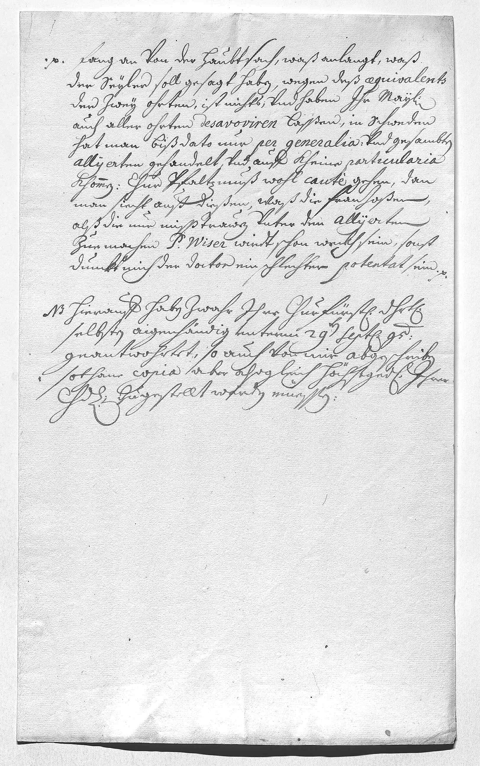 0219der zwey ohrten, ist nichts, vnd haben ihr Mayestät 0220auch aller ohrten desavoviren lasßen, in Schweden 0221hat man biß dato nur per generalia vnd gesambten 0222allijrten gehandelt, vnd auff kheine particularia 0223khommen, Chur Pfaltz muß wohl caute gehen, dan 0224man siecht auß dießem, waß die franzoßen, 0225alß die nur misßtrawen vnter den allijrten 0226zue machen. Pater Wiser wirdt schon weckh sein, sonst 0227 dunkt mich der Doctor ein schlechter potentat sein p. 0228Notabene 0229023002310232023302340235