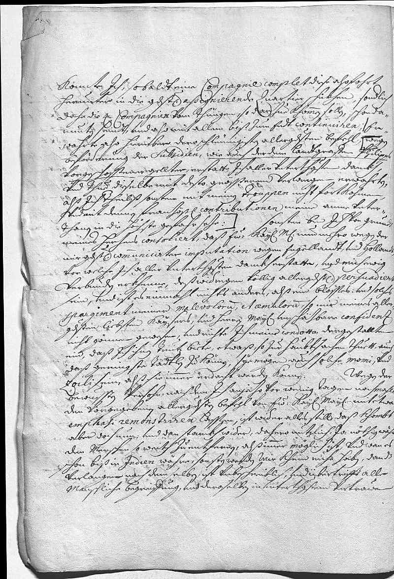 0091könnte ich, sobaldt eine compagnie complet, dise alsofohrt 0092herunter in die gnädigst assignierende quartier schuckhen, sonderlich 0093dahe die 4 compagnien vom Thüngen, so darzue khommen sollen, schon da- 0094runten seindt, vnd also mit allem biß zum endt continuiren; er- 0095wahrte also hierüber dero schleünigisten allergnädigsten befehl. Wegen 0096beförderung der subsidien, wie auch der dem Landtgraffen Philipp 0097vorgeschossenen gellter erstatte ich aller vnterthänigsten dankh, 0098vnd thue dieselbe mit desto grösserem verlangen erwahrten, 0099alß ich theilß sonsten mit meinen trouppen nicht fortkohmen, 0100vnd mit dennen franzößischen contributionen meine arme vnter- 0101thanen in die höchste gefahr seze. Sonsten bin ich von grund 0102meines herzens consoliert, daß ewer kayserliche Mayestät nun mehro wegen der 0103mir gnädigst communicirter imputation wegen Engellandt vnd Hollandt, 0104vor welche ich aller vnterthänigsten danckh erstatte, vnd mich ewig 0105verbunden erkhenne, deß Widmann völlig allergnädigst persuadiert 0106sein, vnd ist es einmahl nichts anders, alß ein blosses- vnd solches 0107spargiment meiner malevolorum et aemulorum, so mir meines aller- 0108gnädigsten liebsten Kaysers, vnd herren Mayestät vnschäzbare confidenz 0109nicht gönnen gewesen, vnd richte ich meine condotta dergestallten 0110ein, daß ich ihnen trutz biete, etwaß, so zur haubtsachen thuett, auch 0111daß geringste tadtlen zu können, sye mögen auch solche momi, vnd 0112zoili sein, alß sie immer erdacht werden können. Wegen der 0113bewussten persohn, nachdem ich anjezo vor wenig tagen nochmahlen 0114den vorgegebenen allergnädigsten befehl von ewer kayserlichen Mayestät mit etwas 0115emphasi remonstriren lassen, ist wider alles still, daß khombt 0116aber doch nun vnd starckh wider, dahero nutzlich, ja nöthig währe, 0117den menschen so weith zu entfernen, alß immer möglich ist, vnd wan es 0118schon biß in Indien währe, sonsten werden wir khein ruhe haben, dan das 0119verlangen nach demselben ist vnbeschreiblich, vnd übertrifft alle 0120menschliche begreiffung, vnd deroselben in vnterthänigstem vertrawen
